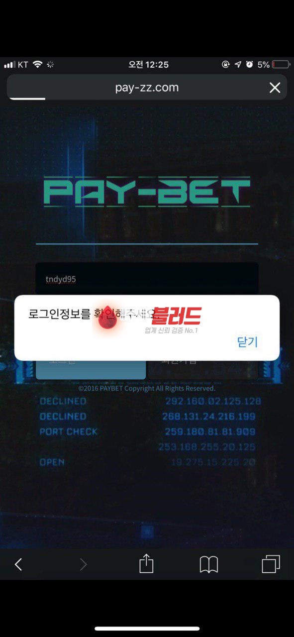 사이트이름 : 페이뱃 도메인 : pay-zz.com 서버등록일 : 2019.07.05 서버위치 : KOREA 먹튀피해금액안 : 미니게임 당첨 이후 환전시 유출픽이라는 이유로 차단 먹튀